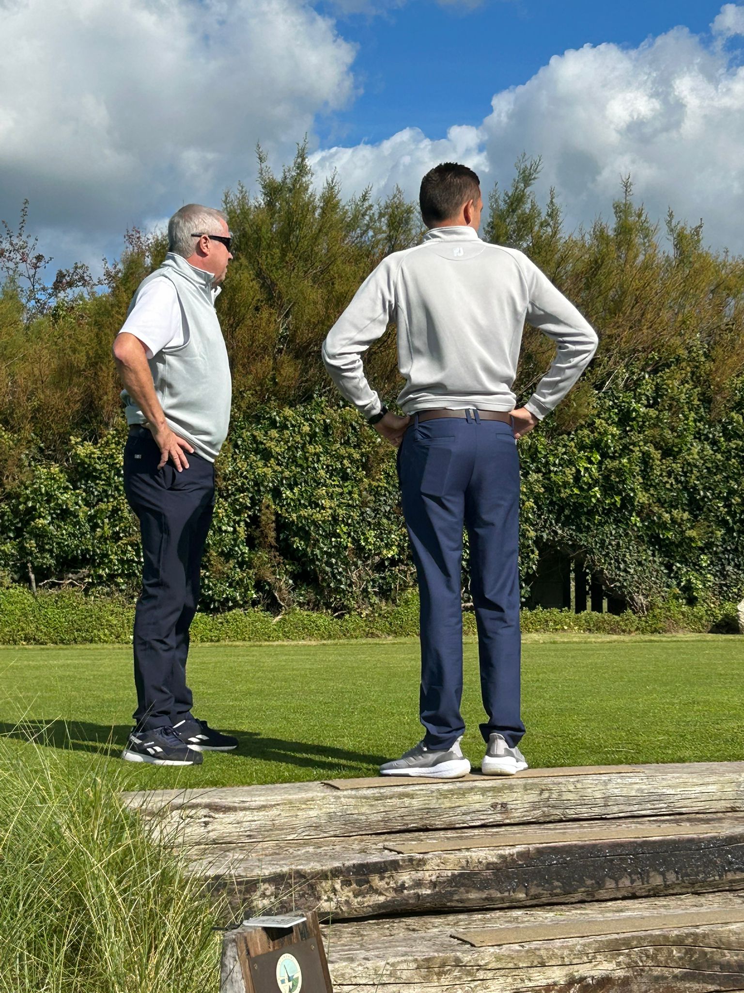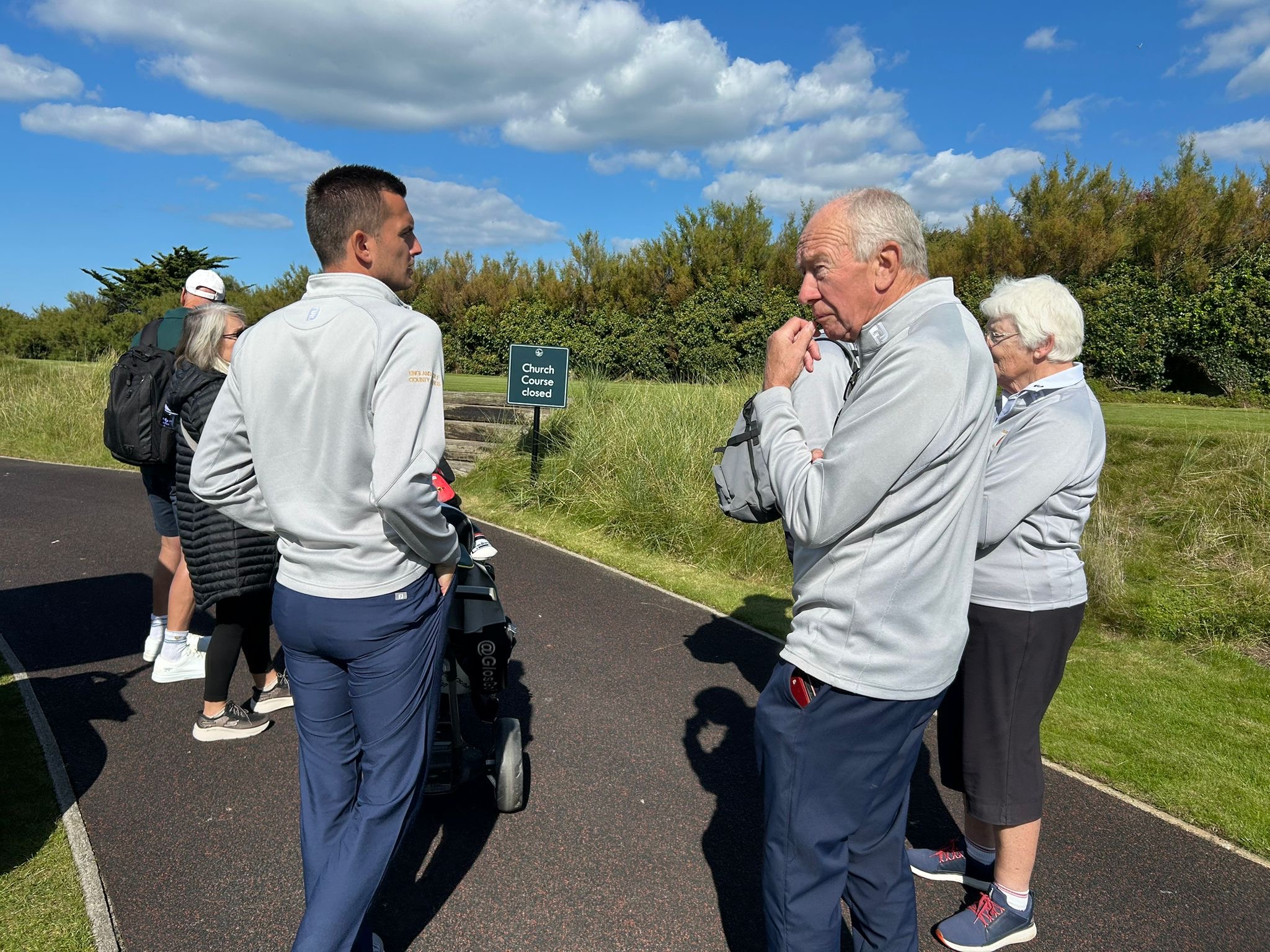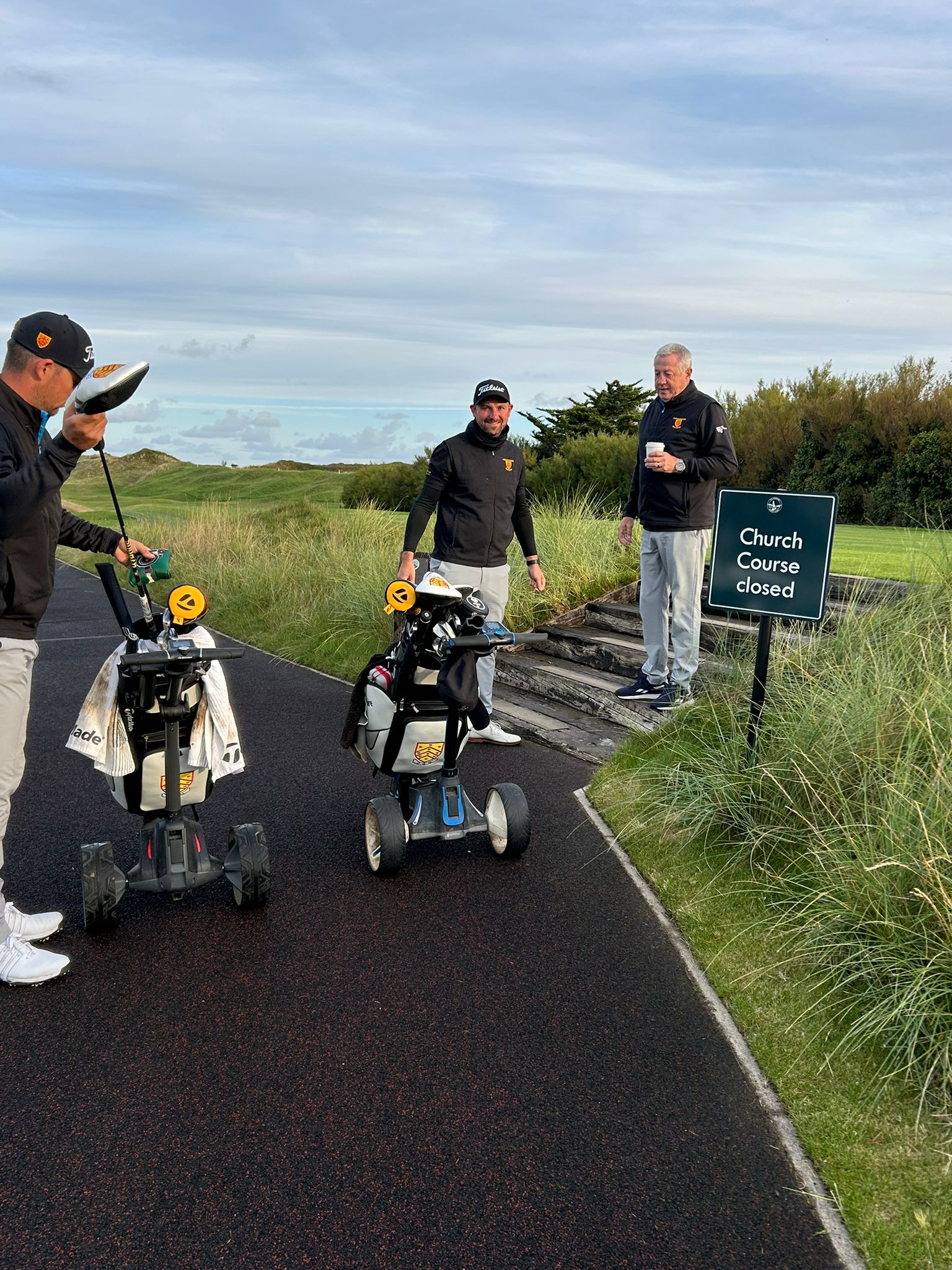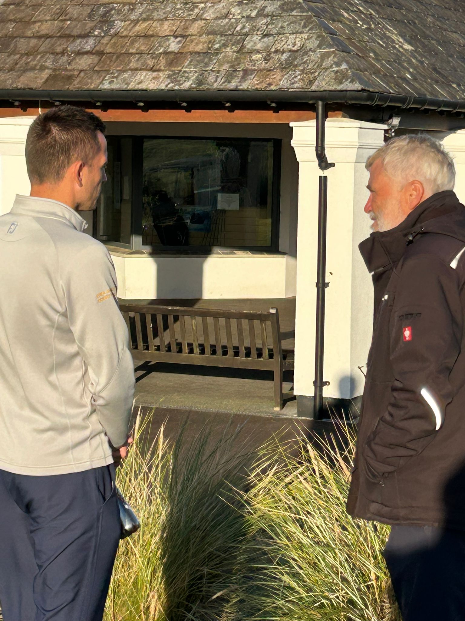 A BIG shout out to all the St Enodoc Volunteers for looking after us all. | A final briefing between Sec and Chief Ref before we get underway | Some final prep! | Leading the way today our youngest pairing - Ash and Louis - play well lads! | Come on Caddy keep up! | |
