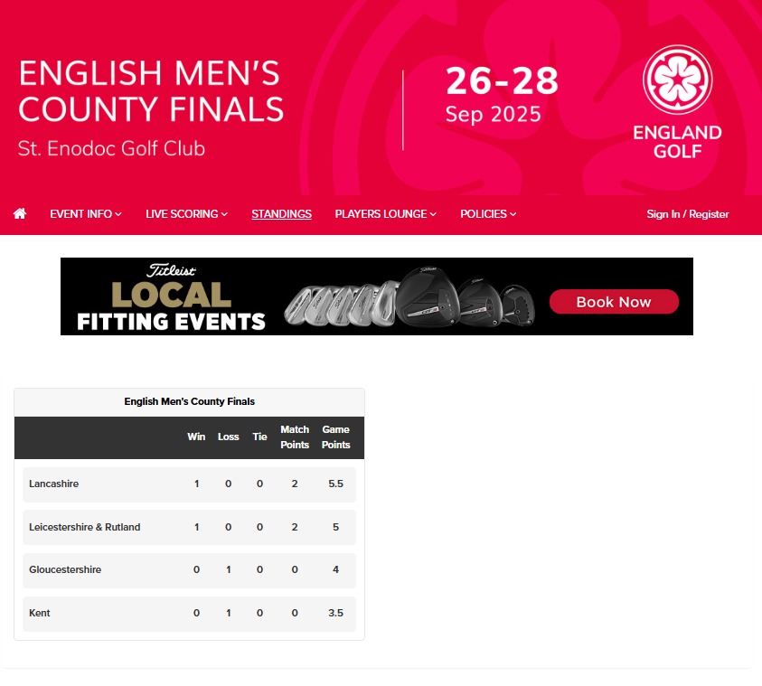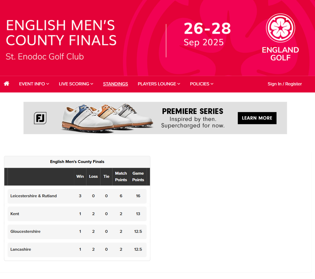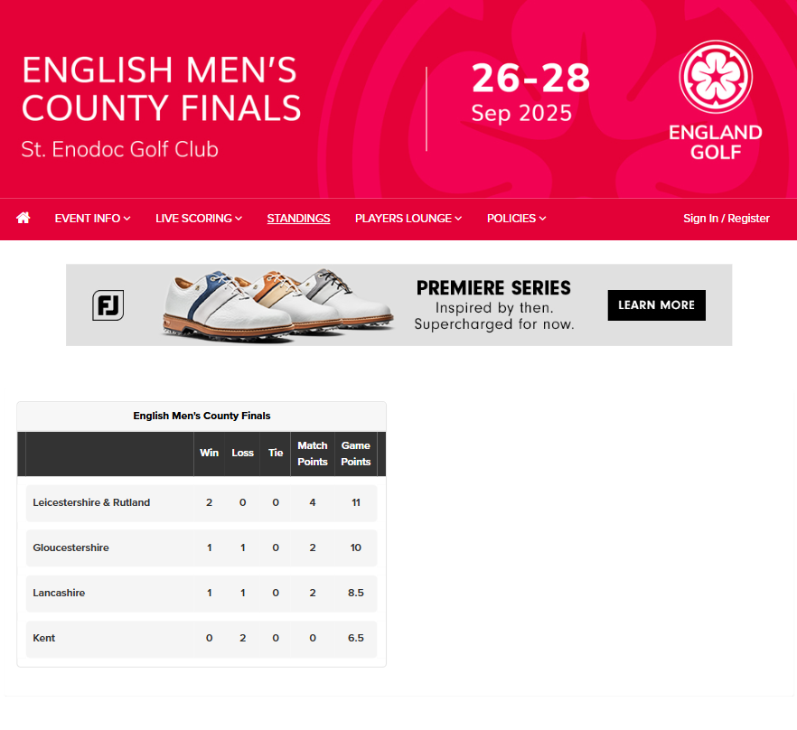 Despite the less than perfect start to the tournament, Gloucestershire were very much still in it. We needed to beat Kent, and Lancashire needed to beat Leicestershire and Rutland for us to take the cup. The morning foursomes didn’t quite go to plan, losing 2 – 1, with 2 matches going down 17 and 18. The afternoon singles started well and , my God, through 9 holes it was game on! The tournament truly was hotting up as Lancashire were taking it to Leicestershire and Rutland! However, pretty soon, the scoreboards started changing, in Leicestershire and Rutland’s favour, taking the wind out of Lancashire’s sails, eventually running out winners. As those scores went up on the scoreboards, we could just see our team feeling a bit downbeat – they never gave up, but no matter what they did, they couldn’t win.