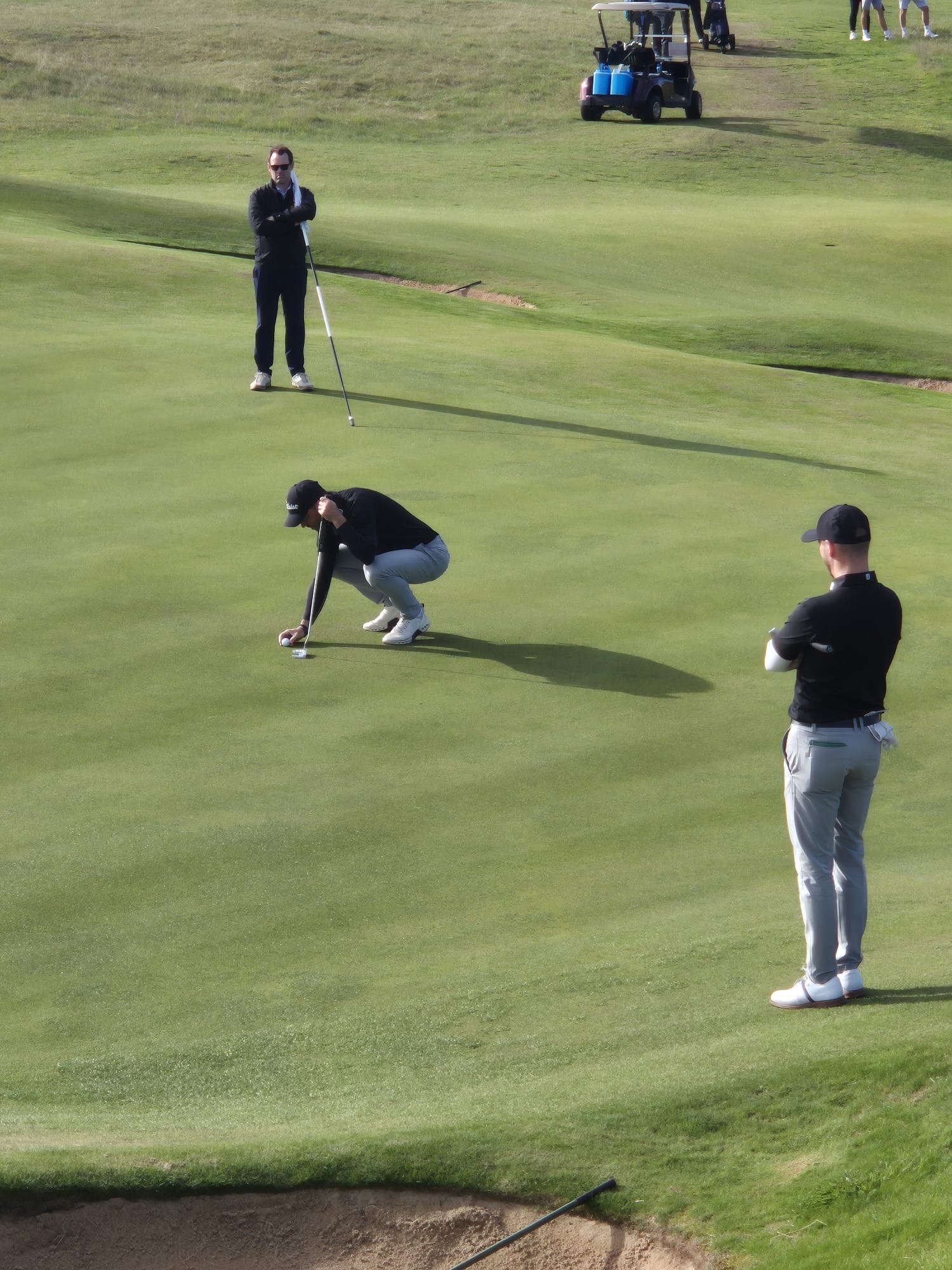 Jake Phillips/Nick Day - Hole 9 - Nick had a 50 feet putt, uphill across the green, which came up 20 feet short. Jake then holed a left to right boomerang, for the half, and gave a fist pump in delight